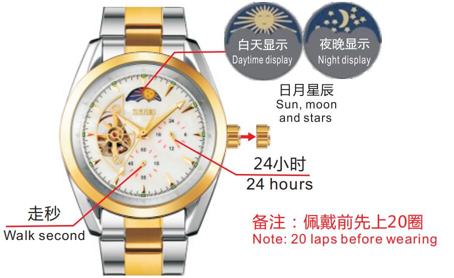 1. Do not pull out the crown from position 0, rotate clockwise (upwards) to wind up the mechanical chain,rotating 20 revolutions can directly replenish enough power.