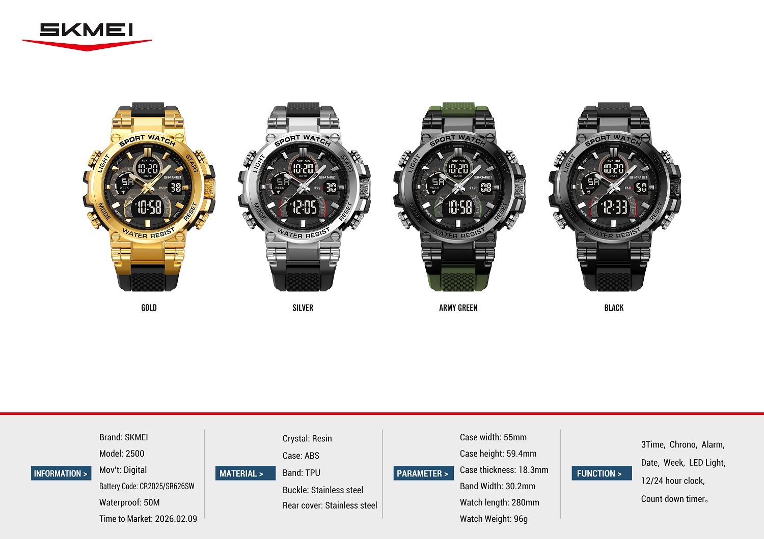 In the global sports watch market, oversized, multi-functional digital timepieces have emerged as a breakout category, dominating sales across Europe, North America, Southeast Asia, and the Middle East. Driven by the demand for bold streetwear aesthetics, heavy-duty outdoor gear, and budget-friendly multi-function watches, this segment delivers consistent high turnover and strong profit margins for retailers, distributors, and private label brands. As a leading professional watch manufacturer with over 20 years of expertise in global B2B trade and fully integrated in-house production, SKMEI is proud to launch our 2026 flagship release: Model 2500, a statement-making rugged sports watch. Officially launched on February 9, 2026, this collection is engineered to deliver unbeatable performance, universal appeal, and exclusive factory-direct benefits to supercharge your global sales growth.