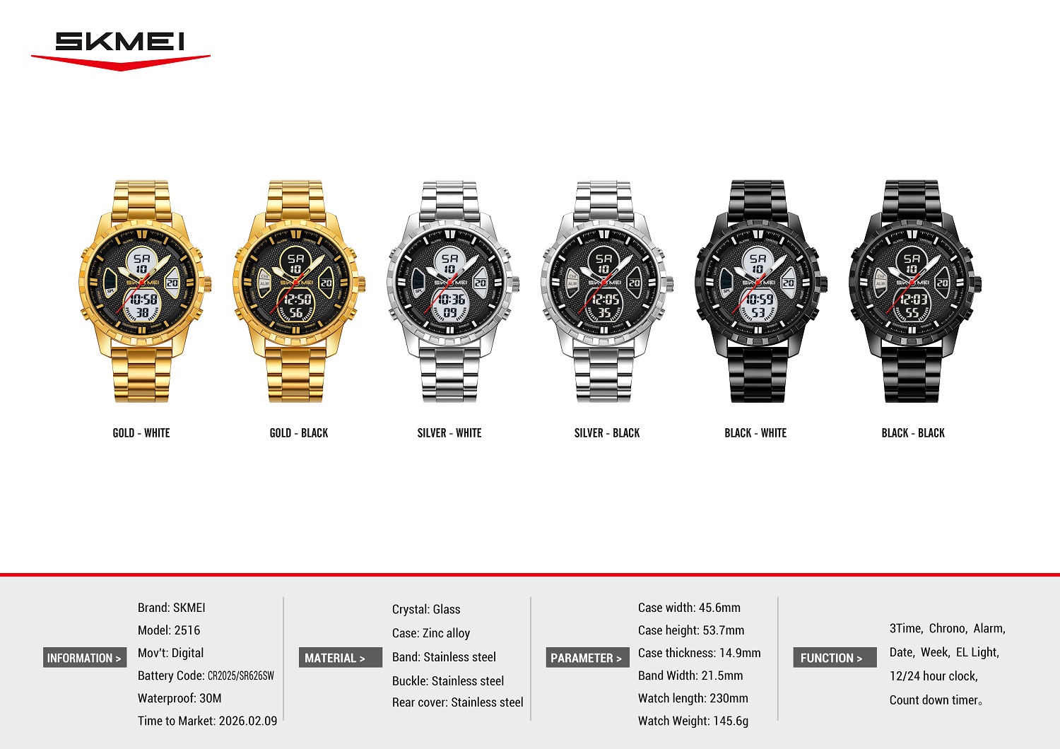 In the global men’s watch market, versatile business-sports hybrid timepieces remain a top-selling, high-margin category year-round. As a professional watch manufacturer with over 20 years of B2B foreign trade expertise, SKMEI is proud to launch our 2026 new release: Model 2516, a premium dual-display watch built for global retailers, distributors, and private label brands.