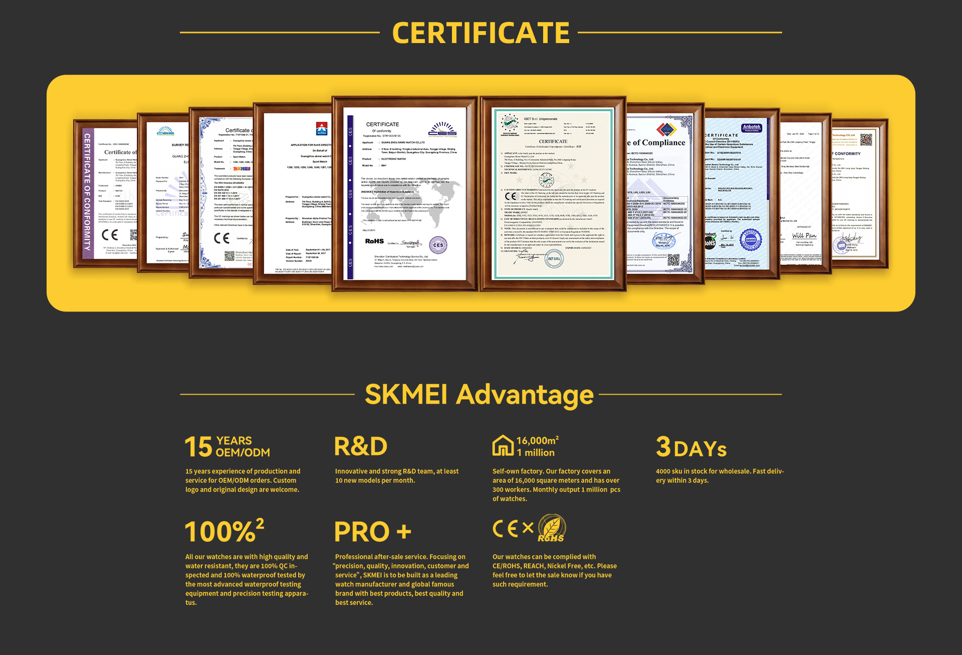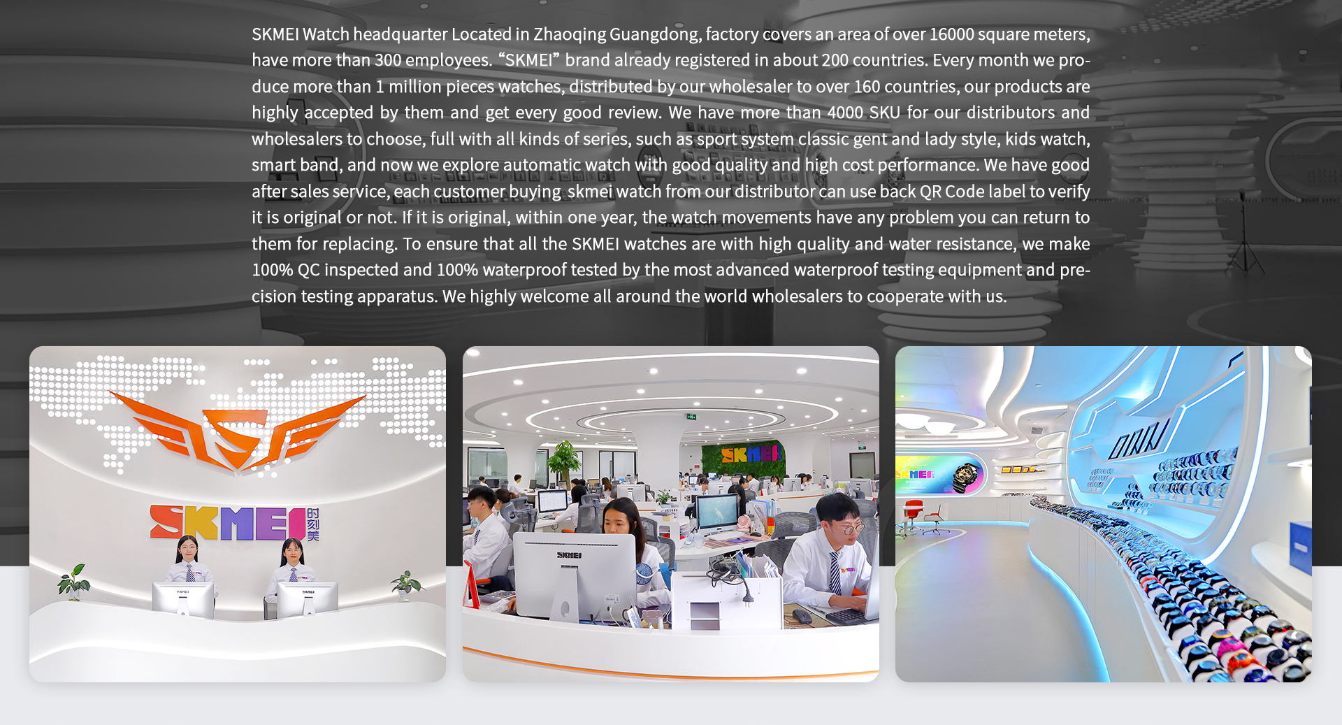 Skmei Watch headquarter Located in Zhaoqing Guangdong, factory covers an area of over 16000 square meters, have more than 300 employees. “SKMEI” brand already registered in about 200 countries. Every month we produce more than 1 million pieces watches, distributed by our wholesaler to over 160 countries, our products are highly accepted by them and get every good review. We have more than 4000 SKU for our distributors and wholesalers to choose, full with all kinds of series, such as sport system classic gent and lady style, kids watch, smart band, and now we explore automatic watch with good quality and high cost performance. We have good after sales service, each customer buying skmei watch from our distributor can use back QR Code label to verify it is original or not. If it is original, within one year, the watch movements have any problem you can return to them for replacing. To ensure that all the SKMEI watches are with high quality and water resistance,we make 100% QC inspected and 100% waterproof tested by the most advanced waterproof testing equipment and precision testing apparatus. We highly welcome all around the world wholesalers to cooperate with us.