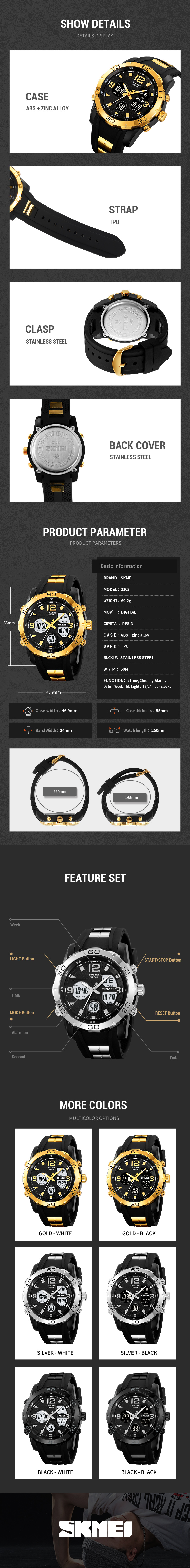 Mov't:Digital Case:Zinc Alloy(46.9mm*55mm) Band:PU W/P:50 Meters Waterproof Function:2Time,Chrono,Alarm,Date, Week,Led light,12/24 Hour Clock. Weight:69.2g