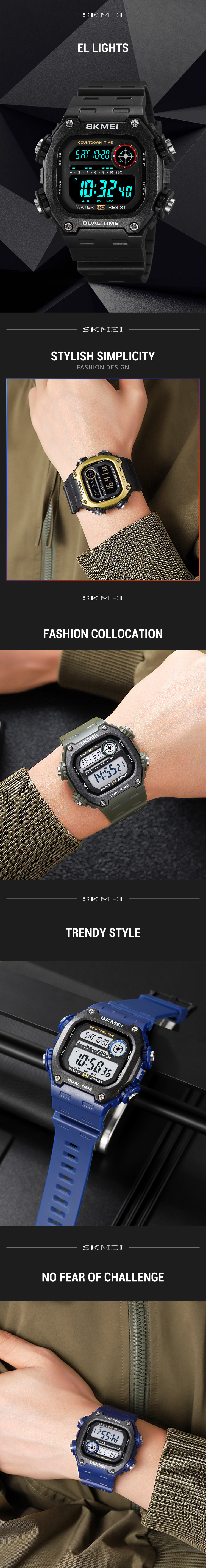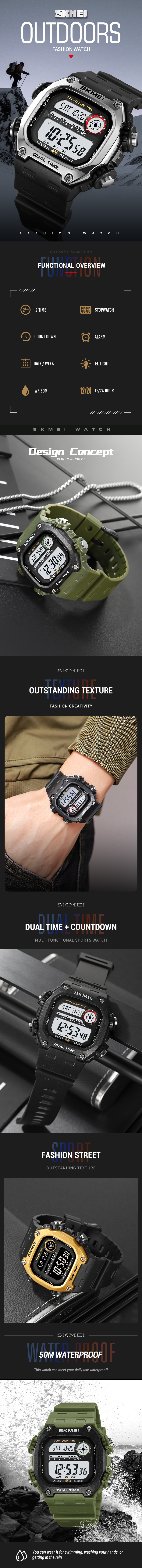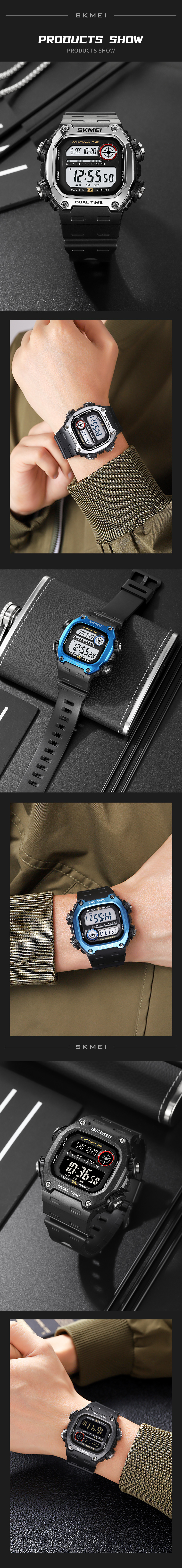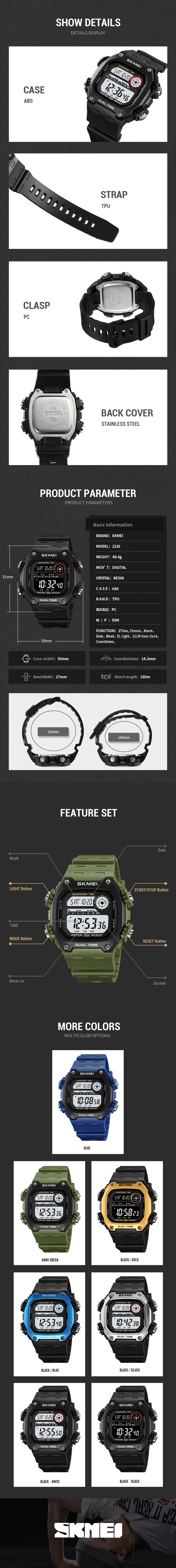 Mov't:Digital Case:ABS (50mm*51mm) Band:PU W/P:50 Meters Waterproof Function: 2 Time,Chrono, Alarm, Date,Week,Count down,Led light, 12/24 Hour Clock. Weight: 48.4g