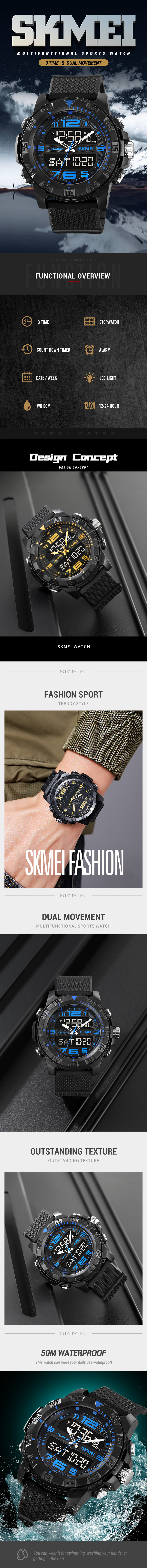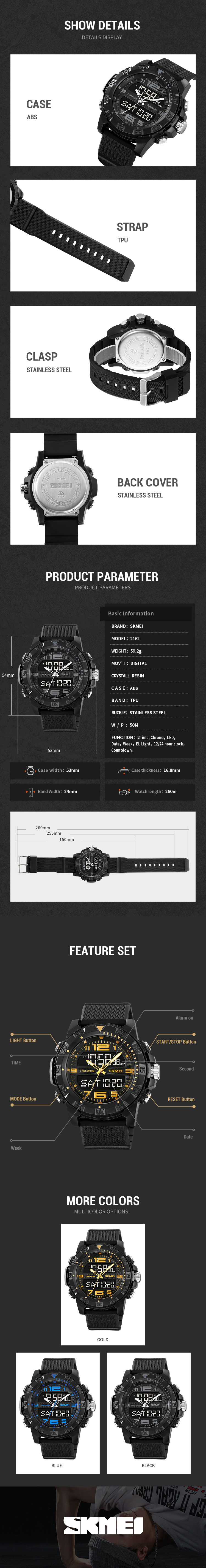 Mov't:Digital Case:ABS (53mm*54mm) Band:PU W/P:50 Meters Waterproof Function: 3Time,Chrono, Alarm, Date,Week,Count down timer,Led light, 12/24 Hour Clock. Weight: 59.2g