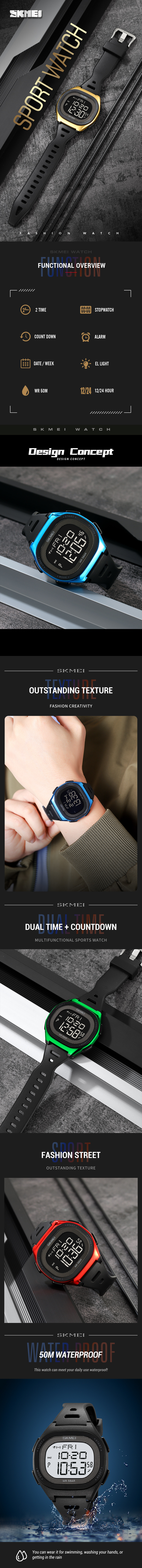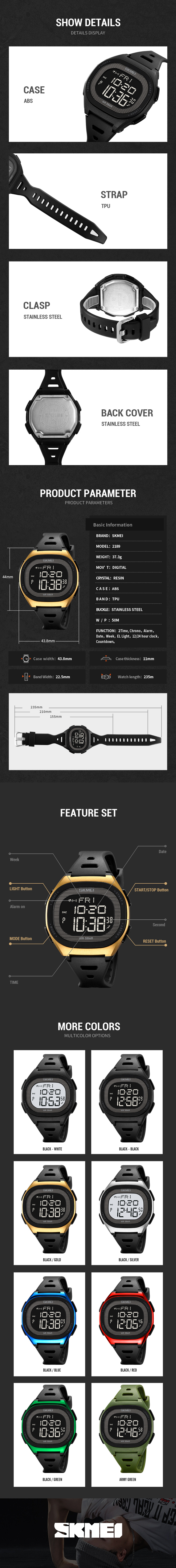 Mov't:Digital Case:abs case(43.8mm*44mm) Band:PU W/P:50 Meters Waterproof Function:2 Time,Alarm,Date,Week, Led light,12/24 Hour clock.Countdown timer. Weight:37.3g