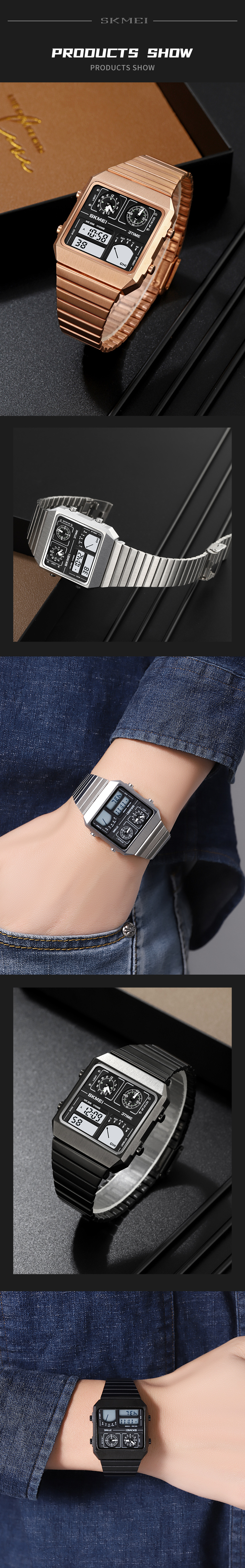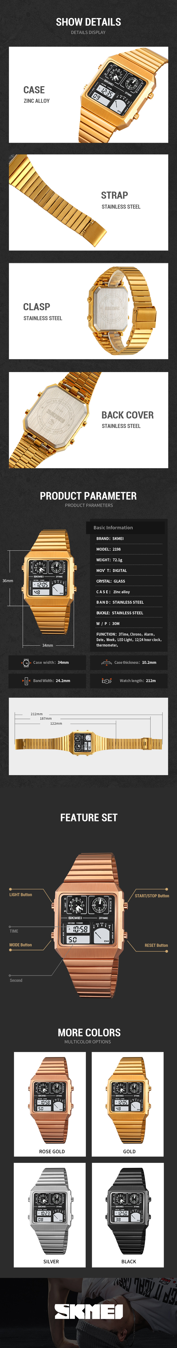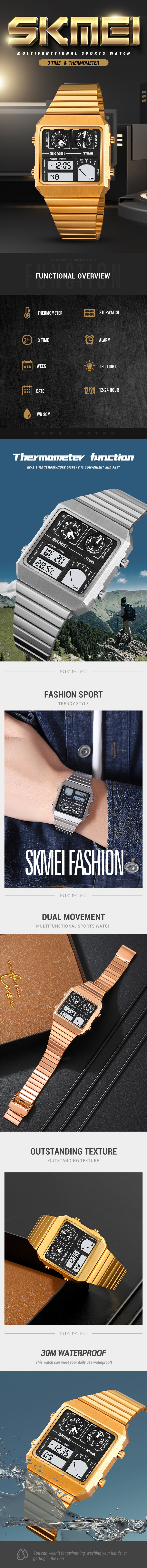 Mov't:Digital Case:alloy case(34mm*36mm) Band:stainless steel W/P:30 Meters Waterproof Function:3Time,Thermometer,Chrono,Alarm,Date,Week, Led light,12/24 Hour clock. Weight:72.1g