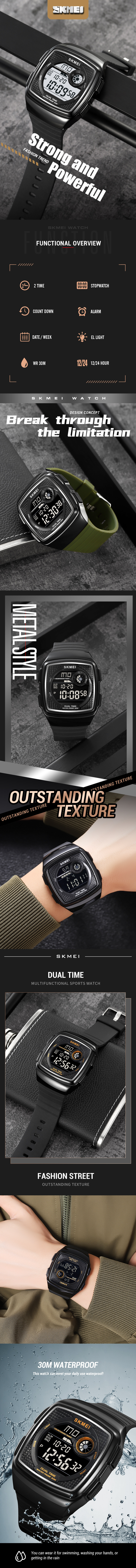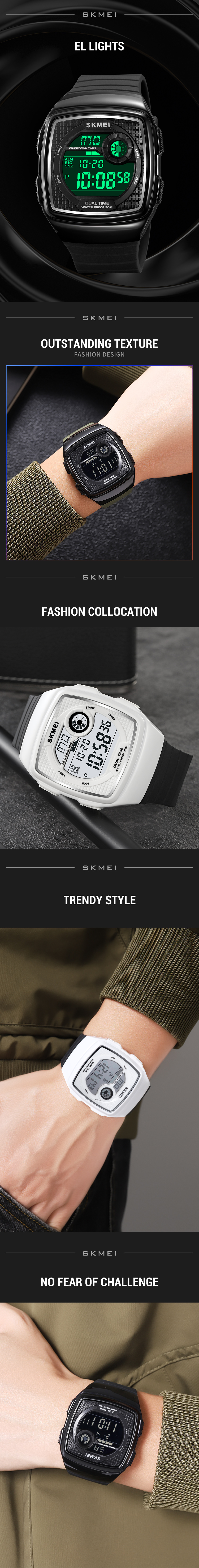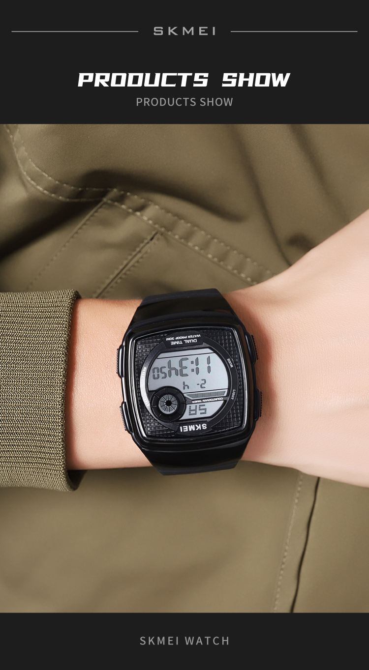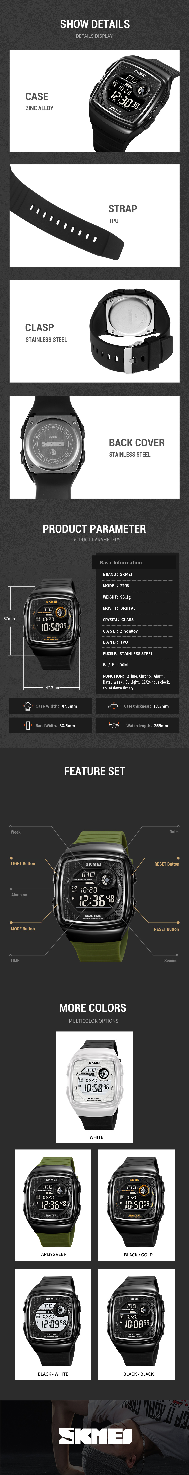 Mov't:Digital Case:ABS(7.3mm*57mm) Band:PU W/P:50 Meters Waterproof Function: 2Time,Chrono, Alarm, Date,Week,Count down,Led light, 12/24 Hour Clock. Weight: 98.1g