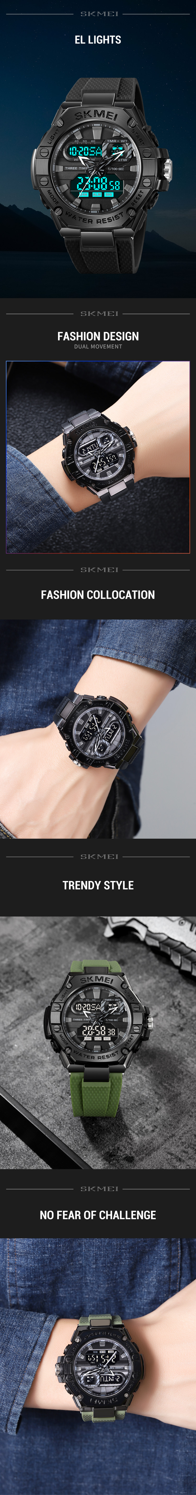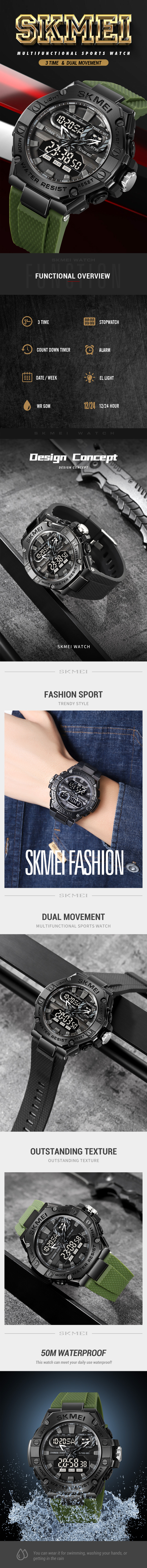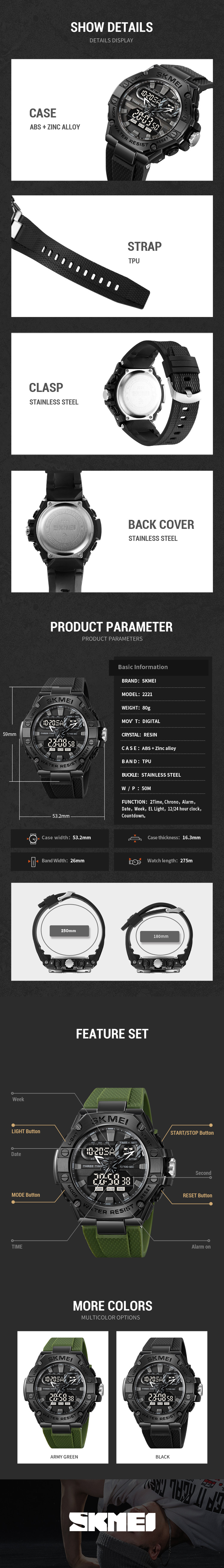 Mov't:Digital Case:ABS (53.2mm*59mm) Band:PU W/P:50 Meters Waterproof Function: 3Time,Chrono, Alarm, Date,Week,Count down timer,Led light, 12/24 Hour Clock. Weight: 80g