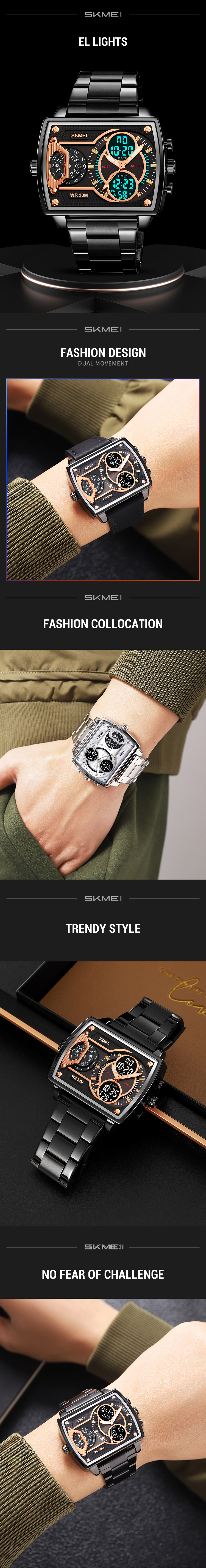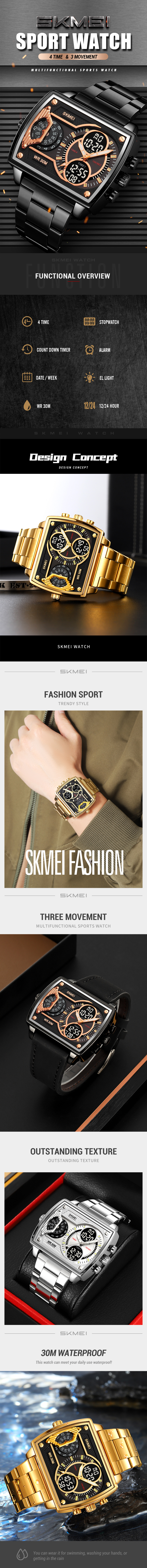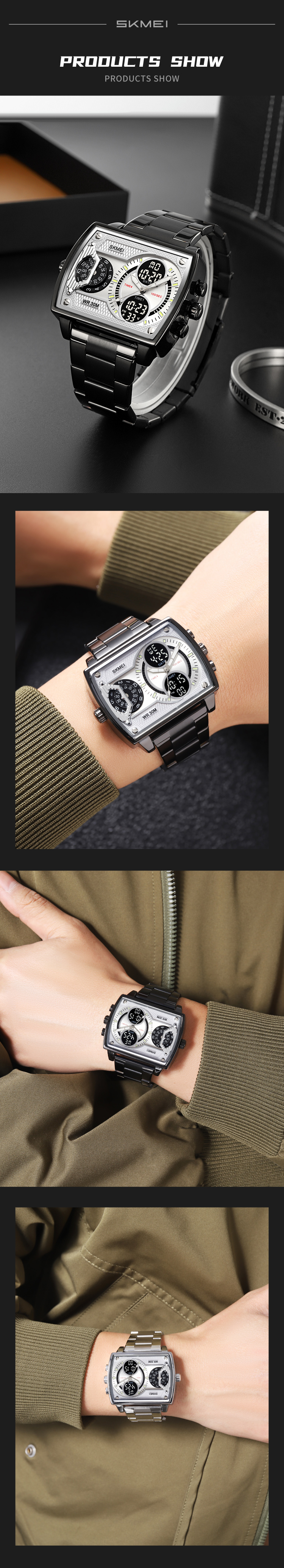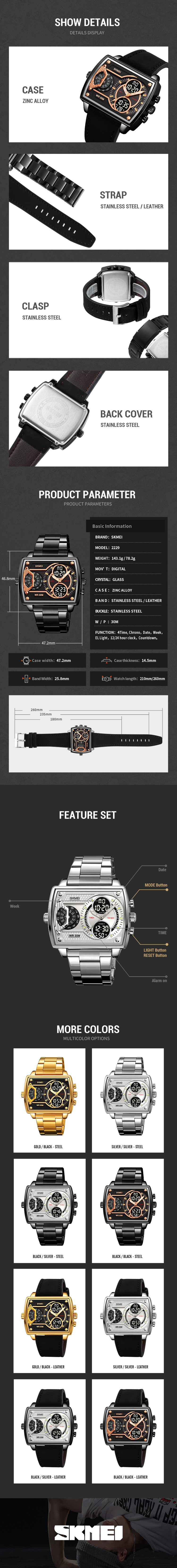 Mov't:Digital Case:alloy(47.2mm*46.8mm) Band:Steel/leather W/P:30 Meters Waterproof Function:4 Time,Chrono,Alarm,Date, Week,Led light,12/24 Hour clock. Weight:143.1/78.2g