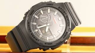 Mov't: Digital Case:ABS(45.5mm*51mm) Band:TPU W/P:50 Meters Waterproof Function: World Time , Chrono,5Alarm,Date, Week, LED light,12/24-hour clock, countdown timer, daylight saving time. Weight:51.5g