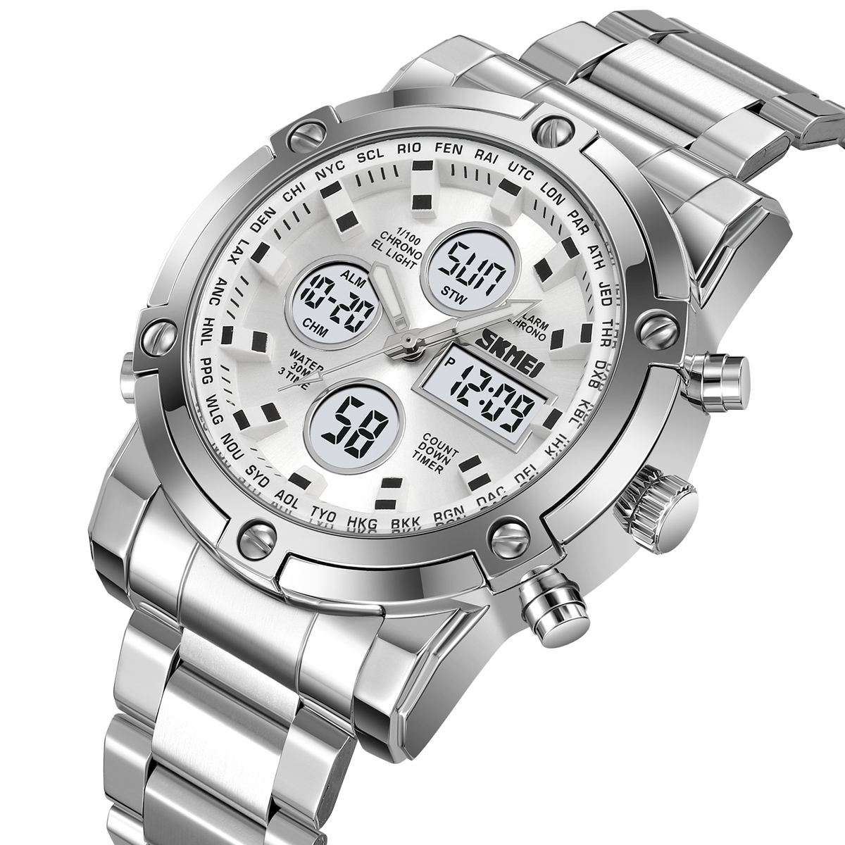 Mov't:Digital Case:Zinc alloy 48.2mm*59mm) Band:Stainless steel W/P:30Meters Waterproof Function: 2Time,Chrono,Alarm,Date,Week,EL Light,12/24 Hour clock,count down timer Weight:164.5g